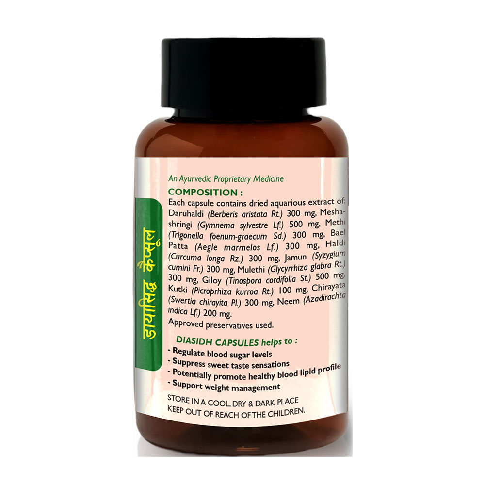 Take control of your blood sugar levels naturally with Diasidh Capsules. Our potent formula combines time-tested ingredients like Daruhaldi, Meshashringi, Haldi, Bael Patta, and Jamun to support healthy glucose metabolism. Each capsule is carefully crafted to help regulate blood sugar levels, improve insulin sensitivity, and promote overall wellness. Ideal for those seeking a natural way to manage their blood sugar, Diasidh Capsules offer a holistic approach to maintaining balanced glucose levels, empowering you to live a healthier, more active life.