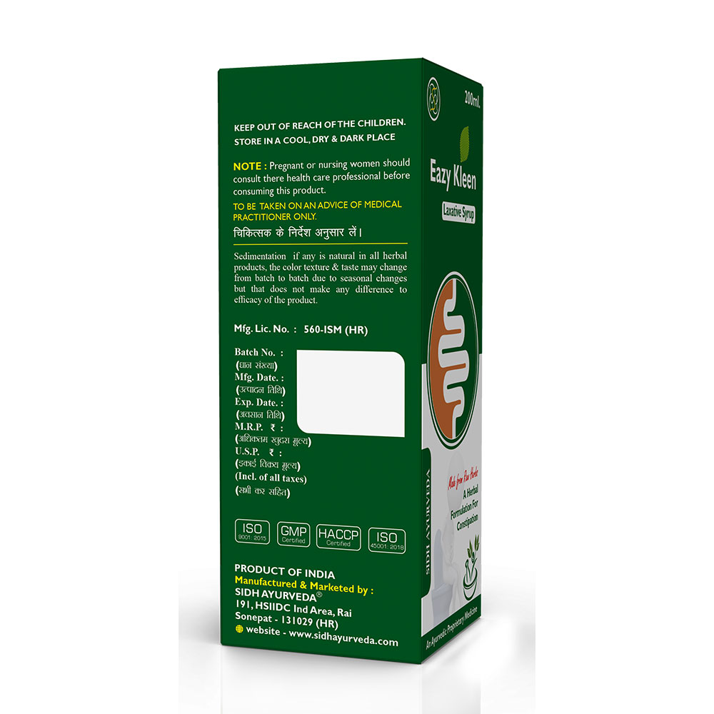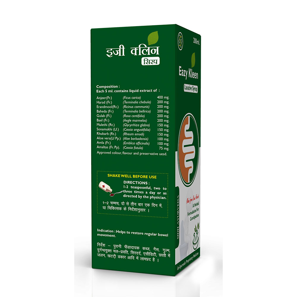 EazyKleen syrup is a natural solution for effective constipation relief. Formulated with a potent blend of traditional herbs like anjeer, harad, bael and Amaltas, this syrup promotes smooth and regular bowel movements while supporting overall digestive health.