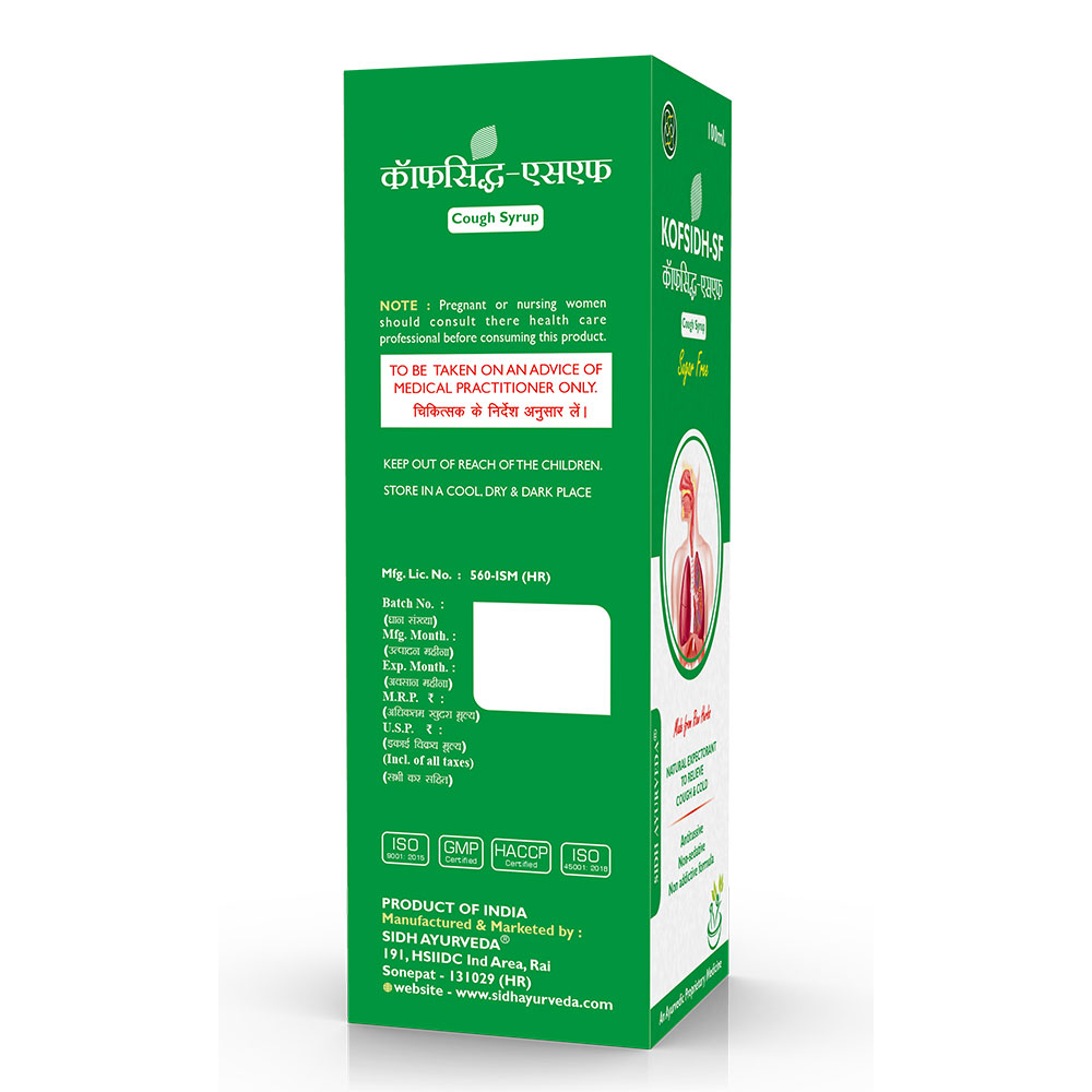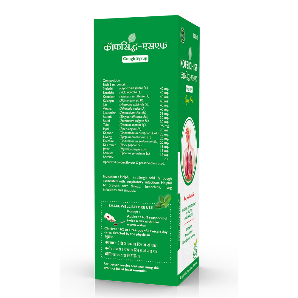 Experience natural relief from cough and respiratory discomfort with Kofsid sugar free Syrup, an Ayurvedic blend of Mulethi, Tulsi, and Vasaka. This potent syrup is formulated to soothe the throat, reduce cough, and support overall respiratory health, making it an essential remedy for cold and flu season.