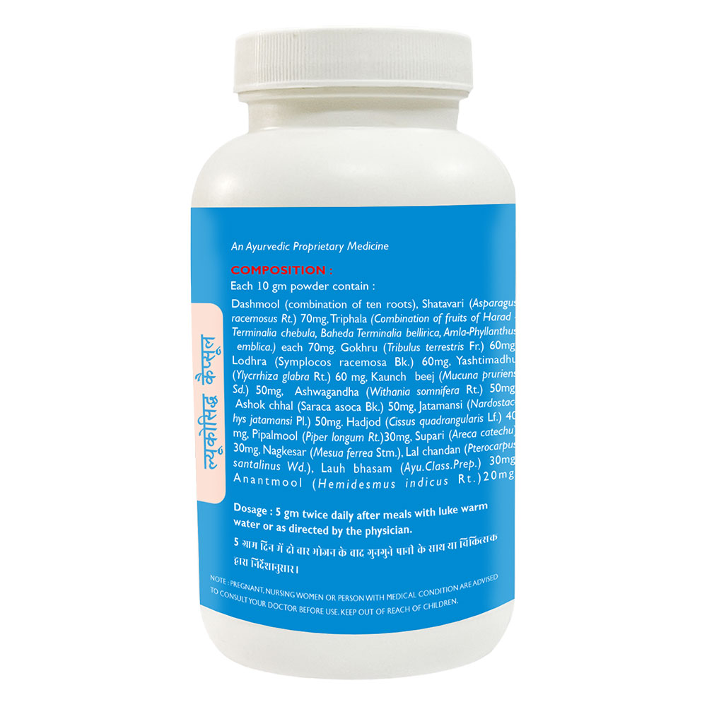 Lukosidh Powder provides soothing relief for women experiencing leukorrhea. Formulated with natural ingredients like ashoka, jamun, shatavari and laal supari it helps maintain vaginal pH balance and supports overall vaginal health.