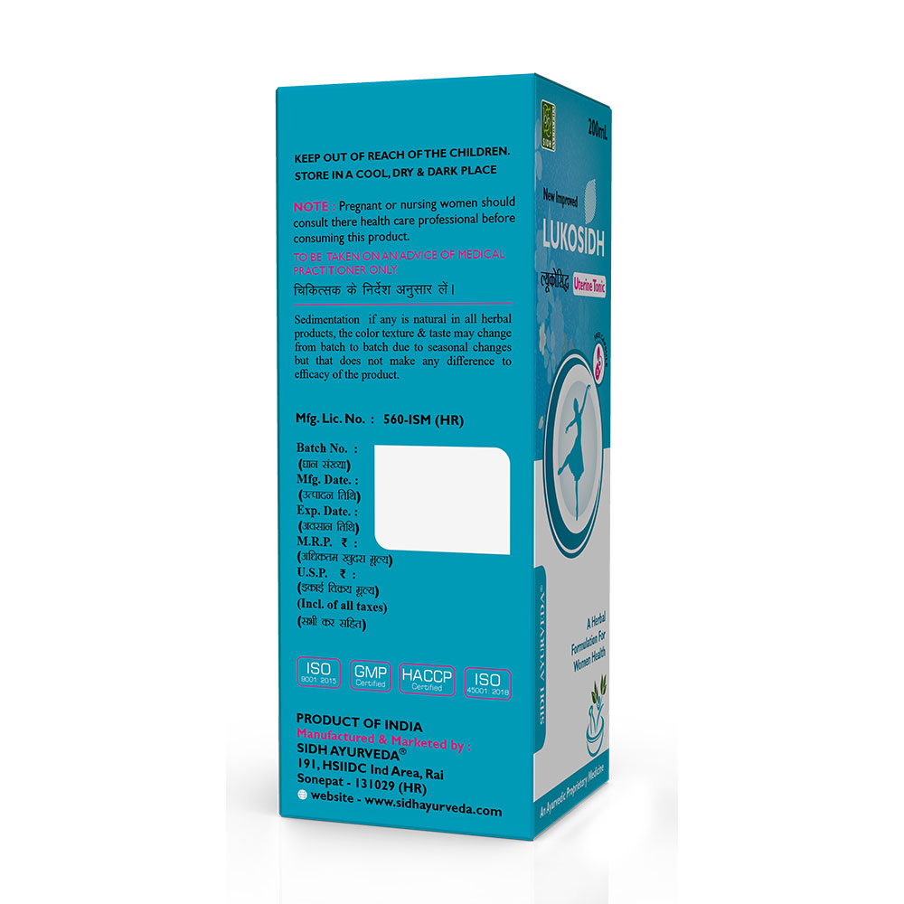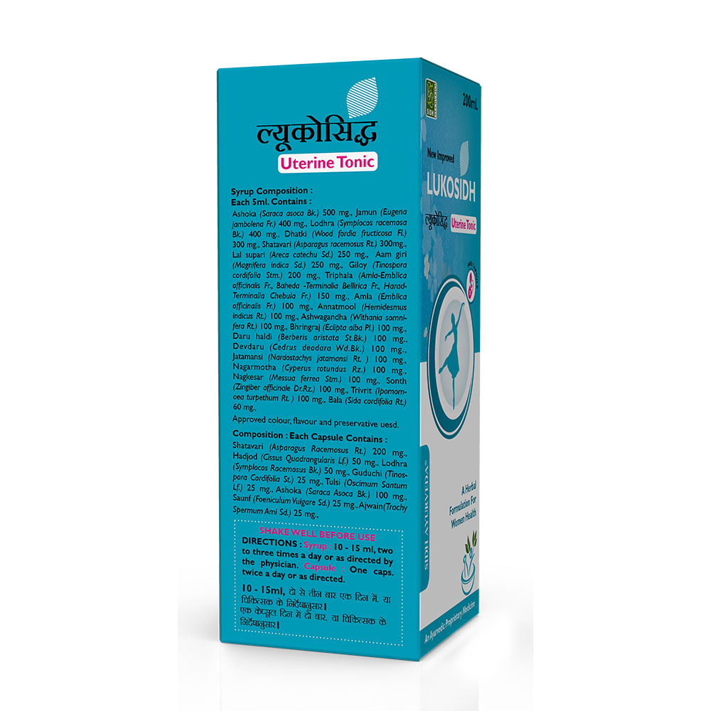 Lukosidh syrup provides soothing relief for women experiencing leukorrhea. Formulated with natural ingredients like ashoka, jamun, shatavari and laal supari it helps maintain vaginal pH balance and supports overall vaginal health.
