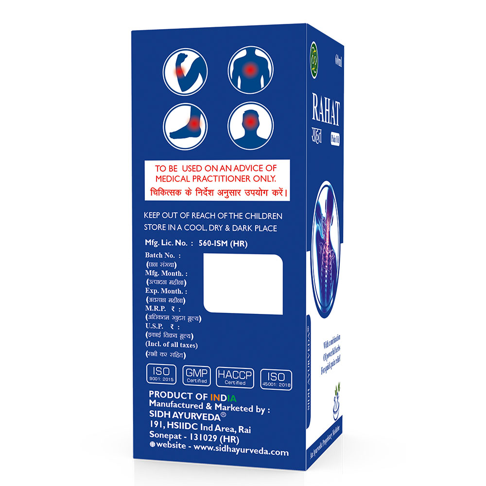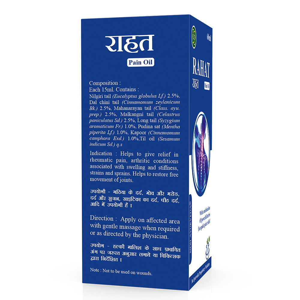 Experience fast and effective relief from aches and pains with Rahat Pain Oil, a powerful blend of Neelgiri Oil, Dalchini Oil, and Mahanarayan Oil. This Ayurvedic formulation is designed to alleviate muscle and joint pain, reduce inflammation, and promote relaxation, offering a natural solution for discomfort and stiffness.Neelgiri Oil (Eucalyptus) is known for its anti-inflammatory and analgesic properties, helping to soothe sore muscles and joints. Dalchini Oil (Cinnamon) improves circulation and provides a warming sensation that helps ease tension and pain. Mahanarayan Oil, a classical Ayurvedic oil, is renowned for its ability to strengthen muscles and joints, reduce inflammation, and support overall mobility.