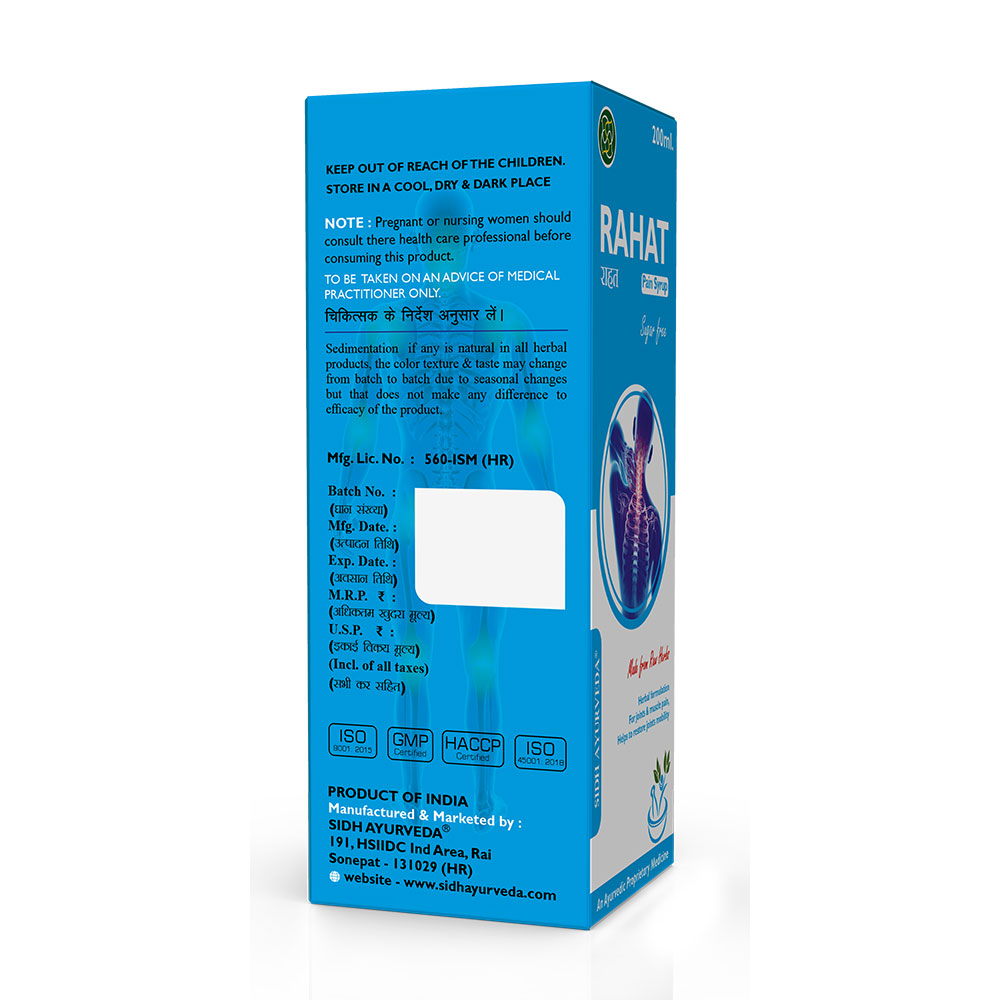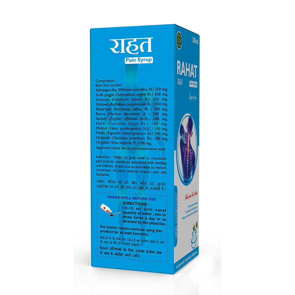 Find natural and effective relief from joint and muscle pain with Rahat Pain Syrup, a thoughtfully formulated blend of Ashwagandha, Sudh Guggal, Suranjan, and Shudh Kulcha. This Ayurvedic syrup is designed to alleviate discomfort, reduce inflammation, and support overall joint and muscle health.Ashwagandha is renowned for its adaptogenic properties, which help reduce stress and inflammation, promoting overall well-being. Sudh Guggal, a potent resin, is well-known for its anti-inflammatory and analgesic effects, helping to relieve pain and support joint health. Suranjan (Colchicum) provides relief from rheumatic conditions and helps ease joint stiffness. Shudh Kulcha enhances the effectiveness of the formula by supporting the body’s natural healing processes.