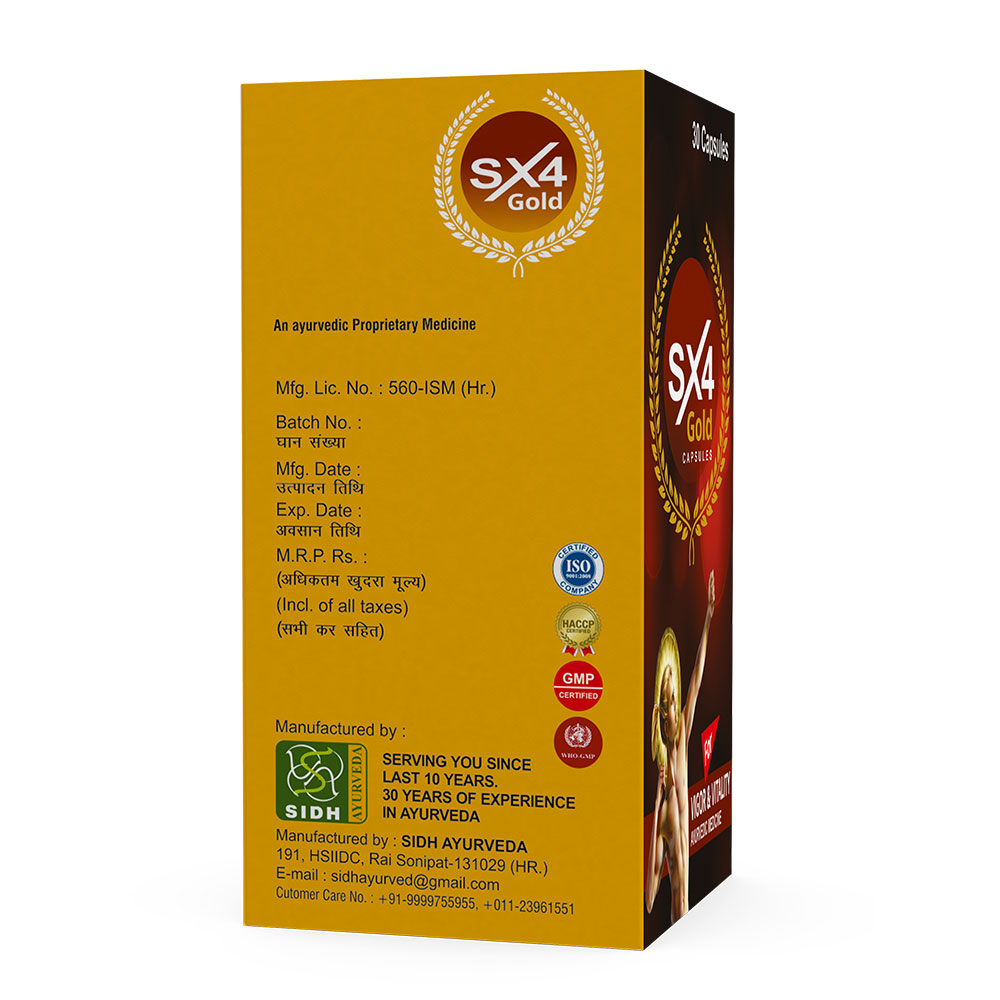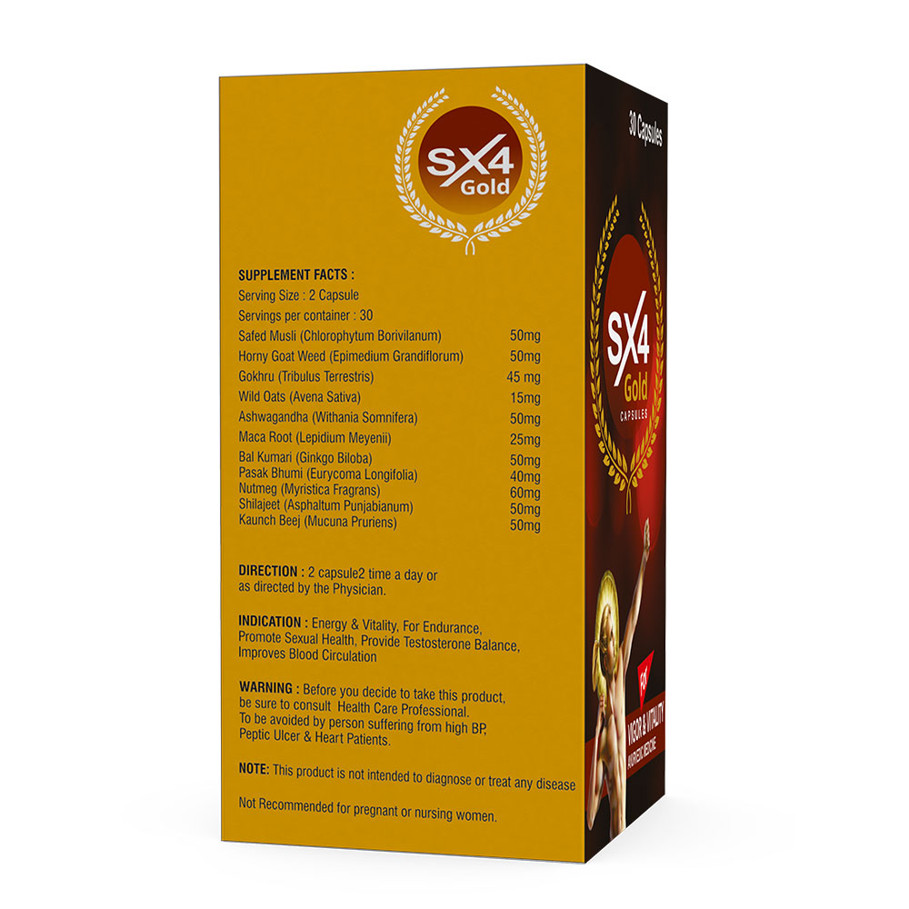 Rediscover your strength and vitality with SX4 Gold Capsules, a powerful blend of Safed Musli and Shilajit. Specially formulated to enhance vigor, stamina, and overall well-being, these capsules provide a natural boost to help you perform at your best every day.Safed Musli is renowned in Ayurvedic medicine for its ability to enhance physical strength, boost endurance, and support sexual health. Shilajit, often called the “Destroyer of Weakness”, is a potent natural resin that rejuvenates the body, promotes energy production, and improves overall vitality.