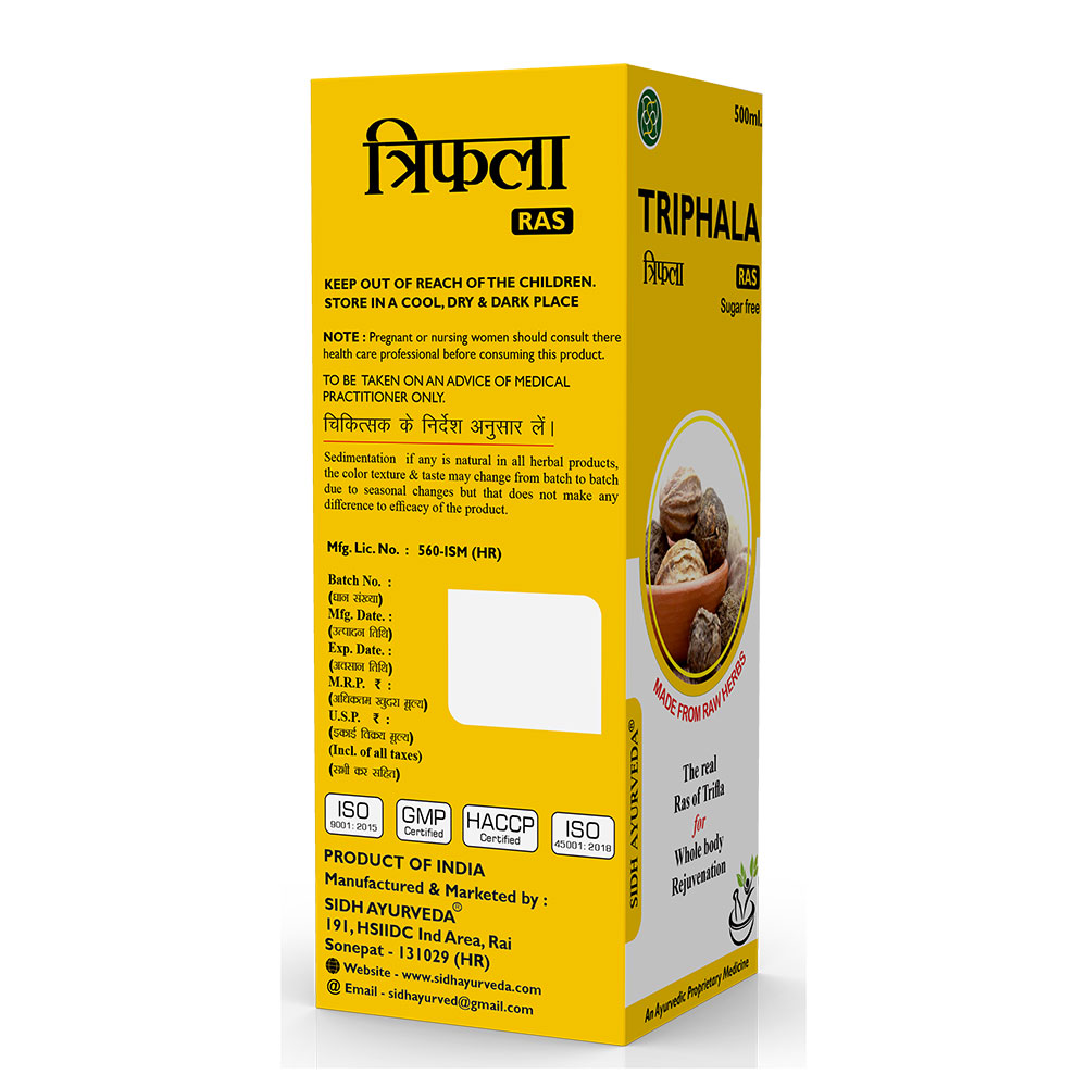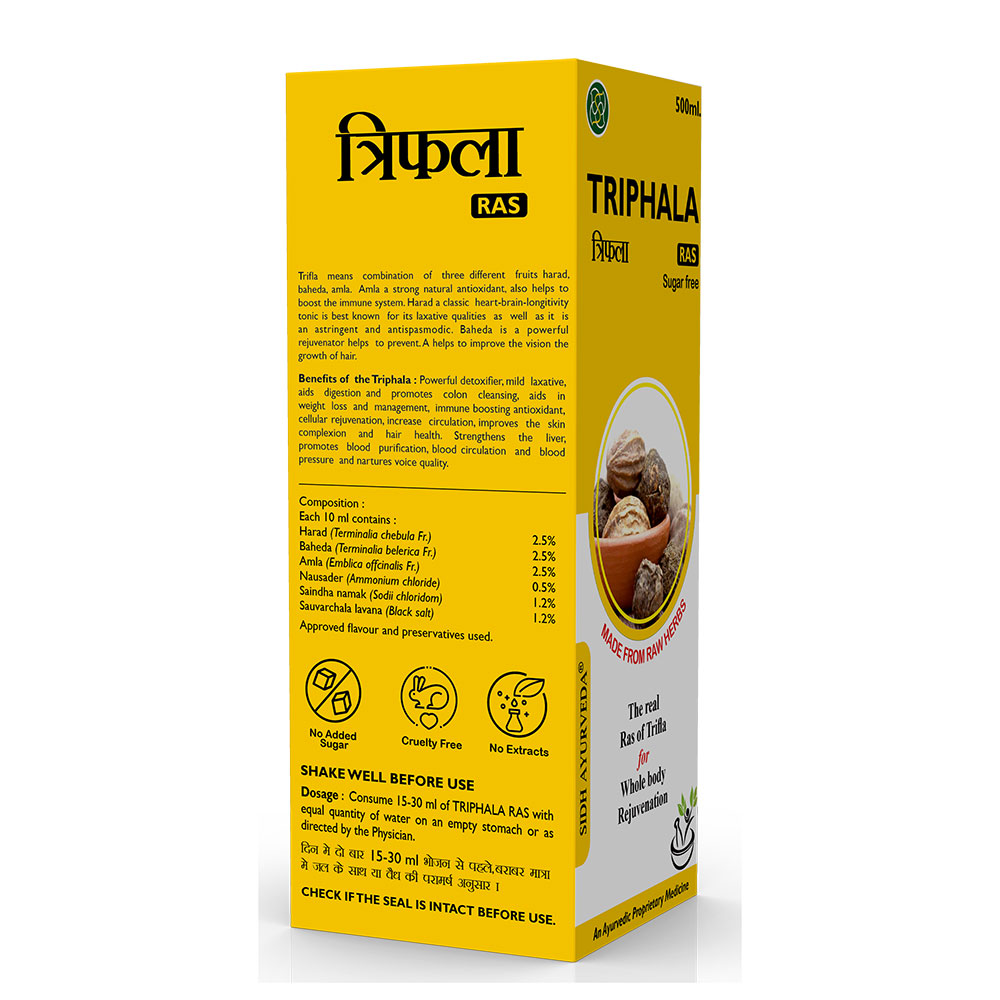 Revitalize your digestive health with Triphala Ras, a potent juice made from the traditional Triphala blend of three powerful fruits: Amla, Harad, and Baheda. This time-honored formula supports digestion, detoxification, and overall wellness, promoting balance and vitality from within.Powerful detoxifier, mild laxative, aids digestion and promotes colon cleansing, aids in weight loss and management, immune boosting antioxidant, cellular rejuvenation, increase circulation, improves the skin complexion and hair health. Strengthens the liver, promotes blood purification, blood circulation and blood pressure and nurtures voice quality.